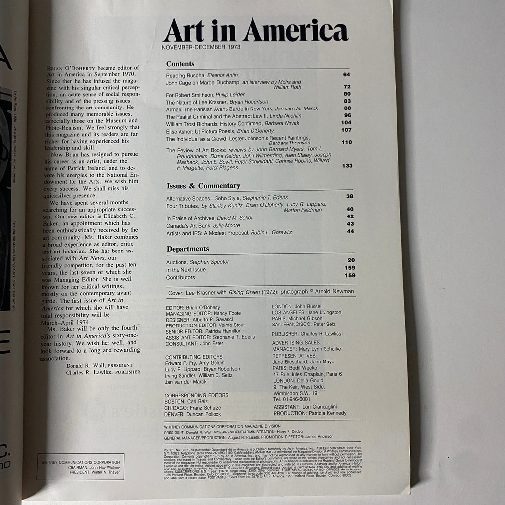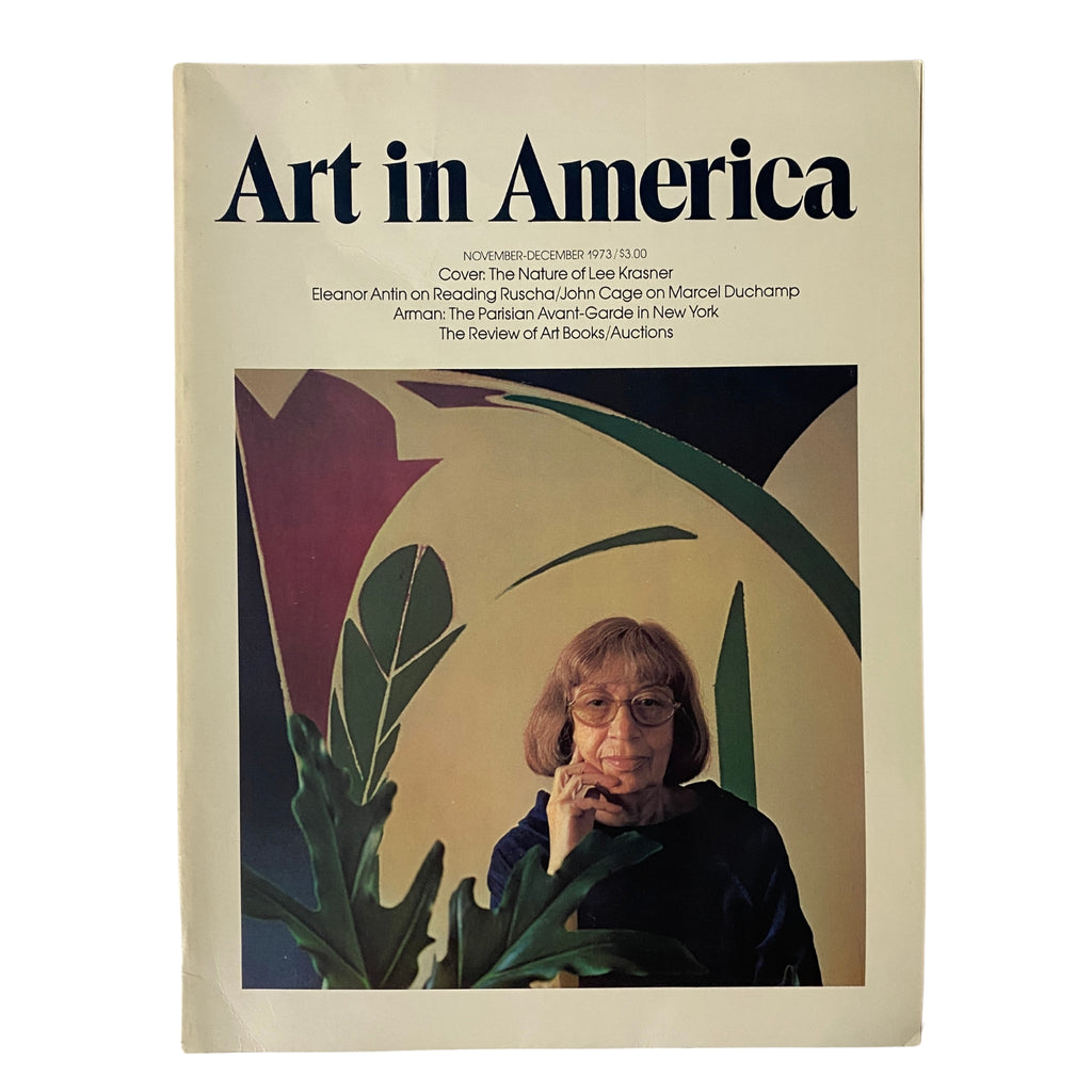 This collectible issue of Art in America, from November 1973, is a significant entry in the world of vintage magazines, specifically focused on the exploration of modern and contemporary art. Featured prominently in this edition is a detailed profile of Lee Krasner, a key figure in the Abstract Expressionist movement, penned by Bryan Robertson in the article titled "The Nature of Lee Krasner." This issue also features timeless insights from avant-garde composer John Cage in his interview discussing Marcel Duchamp, alongside critical analyses of notable artists like Robert Smithson, Ed Ruscha, and Arman.
