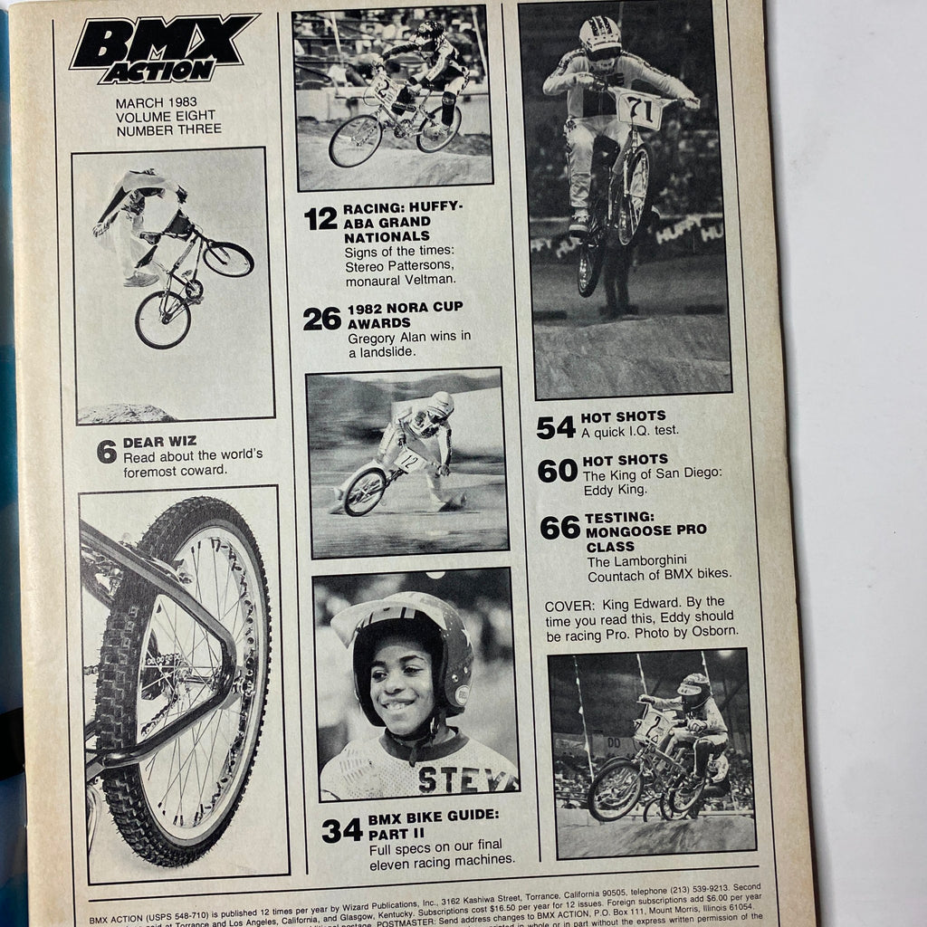 This March 1983 issue of BMX Action Magazine features Eddy King—aka "King Edward"—on the cover, just as he prepares to transition into the pro ranks. Known for his dominance in San Diego and electric race presence, this issue captures a pivotal moment in King’s rise. Inside, readers will find a mix of race recaps, award highlights, gear testing, and the final installment of the BMXA Bike Guide series.