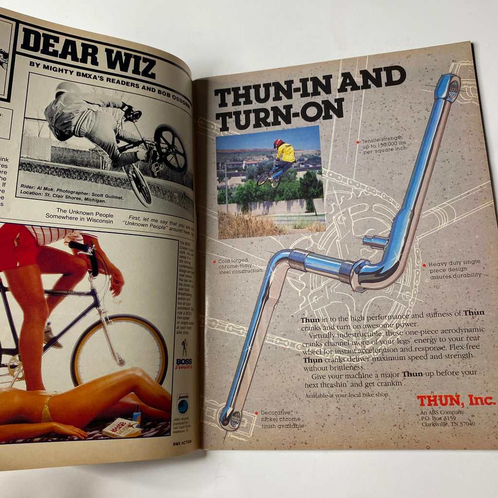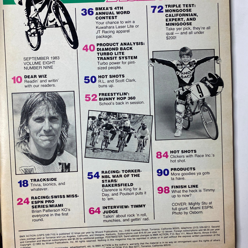 This September 1983 issue of BMX Action Magazine features Mighty Stu Thomsen in peak form on the cover, captured mid-race at the Miami ESPN Pro Series by legendary BMX photographer Osborn. Inside, readers will find a dynamic mix of racing recaps, freestyle tutorials, product reviews, interviews, and one of BMXA’s most beloved contests. This issue reflects the raw energy and personality that defined early-’80s BMX culture.