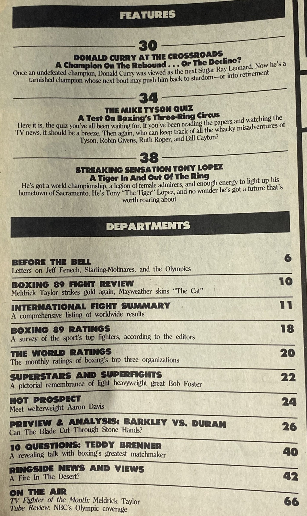 This January 1989 issue of Boxing 89 Magazine features Mike Tyson on the cover, capturing the heavyweight champion during the height of his fame. Inside, readers will find in-depth features on Tyson’s tumultuous world outside the ring, alongside coverage of boxing’s rising stars and legendary veterans.