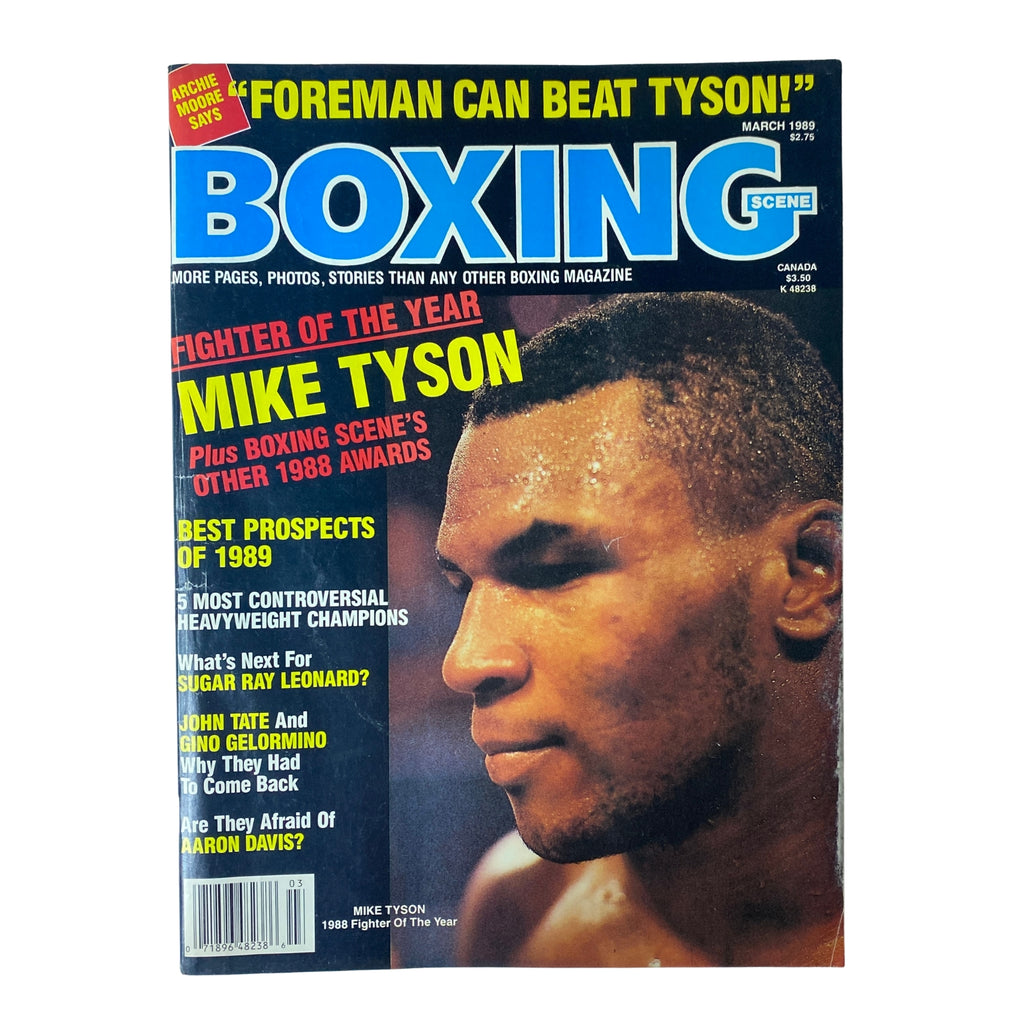 This vintage Boxing Scene magazine from March 1989 features Mike Tyson on the cover and highlights him as Boxing Scene’s Fighter of the Year. The issue offers a deep look into Tyson’s dominance, comparisons to Joe Frazier, and George Foreman’s chances of dethroning him. It also includes features on Sugar Ray Leonard, Aaron Davis, Lou Duva, and other key boxing figures of the late 1980s.