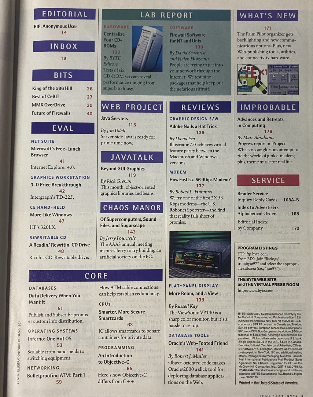 This vintage issue of Byte, Vol. 22, No. 6 (June 1997), features special coverage on databases during a pivotal era when the Web was beginning to transform data management and enterprise computing. Highlights include an in-depth look at Oracle’s tools for deploying applications online, the promises of “publish and subscribe” data delivery, Objective-C programming, advances in smartcards, firewall software for NT and Unix, and Jerry Pournelle’s classic Chaos Manor column.