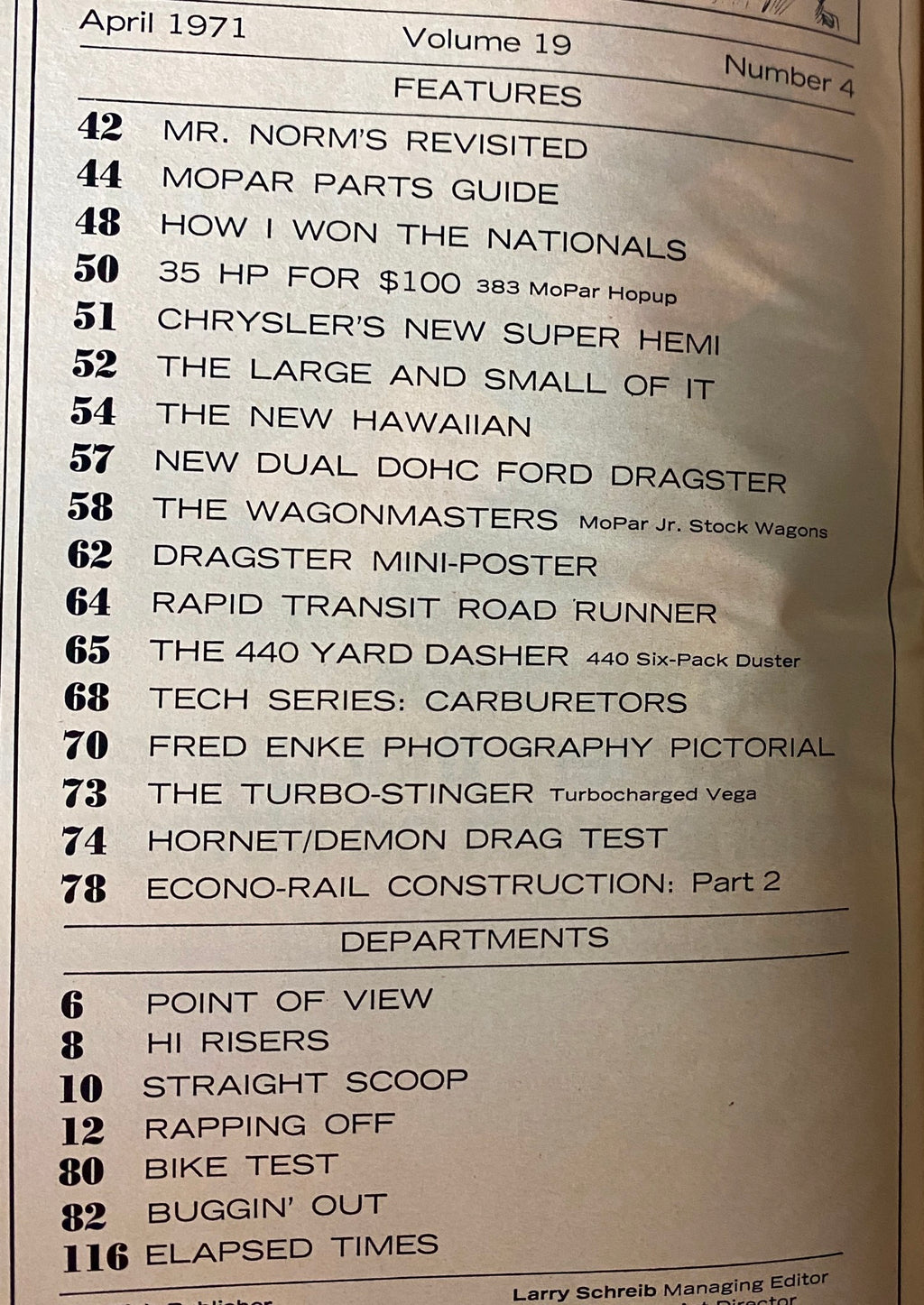 An excellent collector’s item for vintage Mopar fans and drag racing historians alike, this issue provides in-depth reporting, technical detail, and period photography that define the early 1970s performance scene.