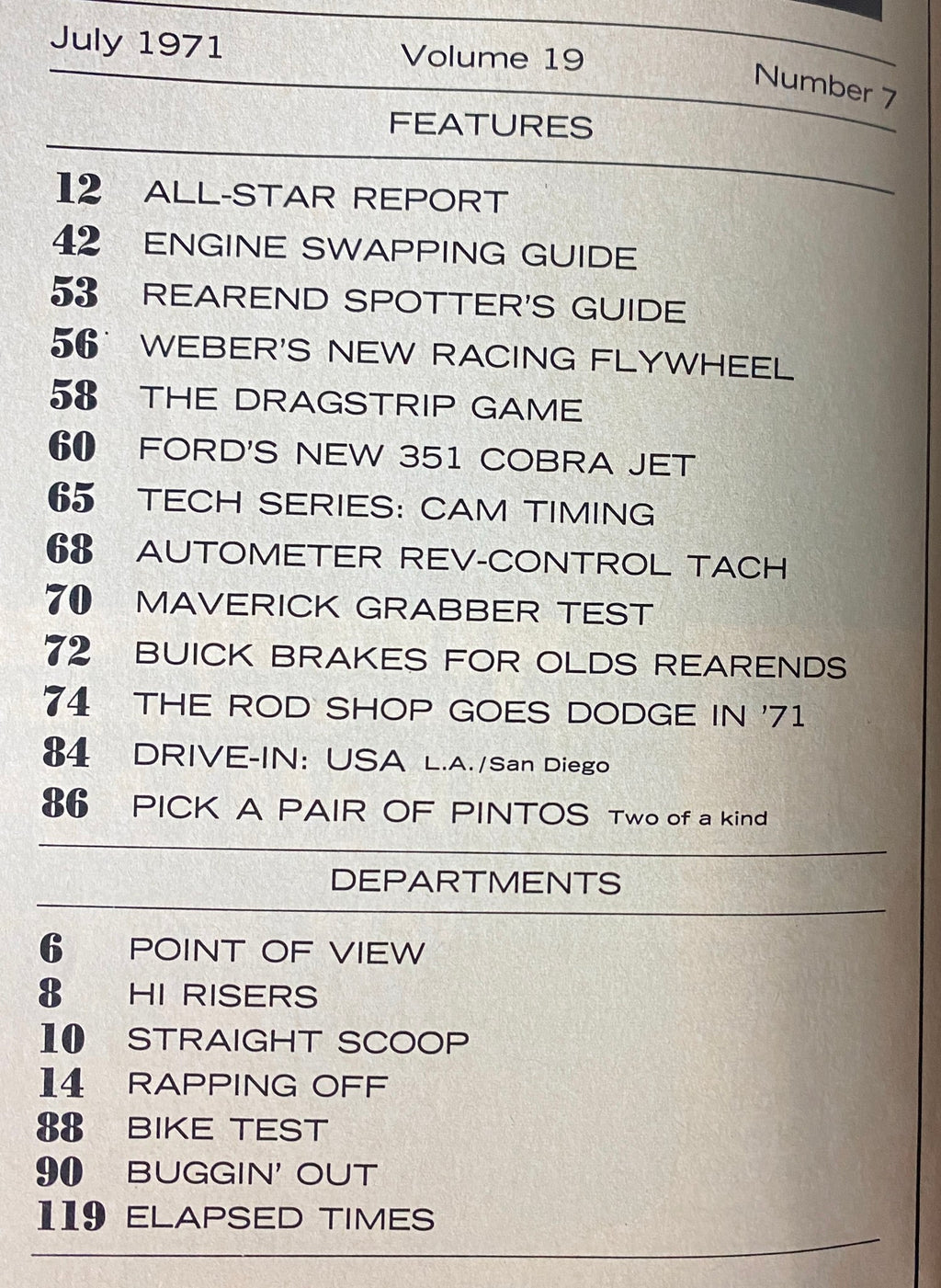 This July 1971 issue of Car Craft Magazine (Vol. 19, No. 7) features the Wild Weslake 340 V-8-powered Colt Wagon and delivers a deep dive into engine swaps, dragstrip tech, and performance innovations of the early 1970s. With its balance of technical guides and real-world tests, this issue captures a pivotal moment in street and strip performance culture.