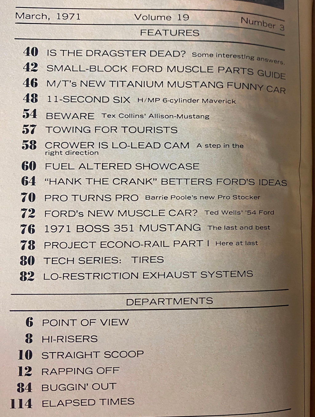 This March 1971 issue of Car Craft Magazine (Vol. 19, No. 3) features Mickey Thompson’s groundbreaking titanium Mustang Funny Car, along with a comprehensive range of technical insights and performance spotlights that defined early '70s drag racing and hot rodding culture.