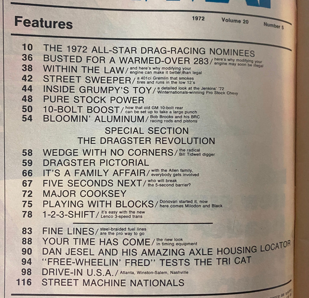 This May 1972 issue of Car Craft Magazine (Vol. 20, No. 5) features the explosive Dragster Revolution special section, showcasing cutting-edge developments in the world of top-fuel racing. From wedge motors and pictorial spreads to family-run teams and future 5-second runs, this issue delivers a deep dive into the early '70s drag scene. Also included is an inside look at Grumpy’s Toy, aluminum engine tech, and pure stock power builds.