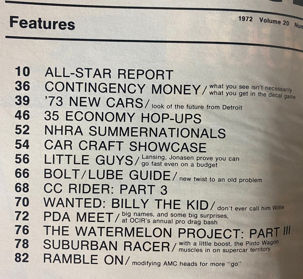 This listing features the October 1972 issue of Car Craft Magazine, highlighted by the feature Wanted: Billy The Kid—a spotlight on Billy Stepp’s Pro Stock Dodge Demon. This issue also includes a preview of the 1973 model year cars, 35 economy hop-ups, coverage of the NHRA Summernationals, and Part III of The Watermelon Project.