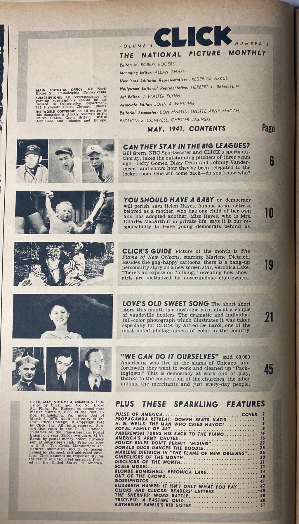 Presented here is the May 1941 issue of Click Magazine, Volume 4, Number 5, spotlighting the legendary Marlene Dietrich in her latest role in The Flame of New Orleans. This issue captures a dynamic moment in American entertainment and society, with wide-ranging coverage from sports to civic engagement and cinema.
