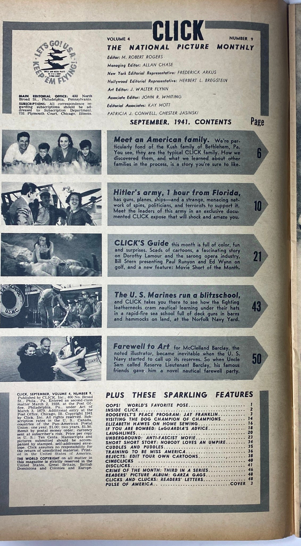 Available here is the September 1941 issue of Click Magazine, Volume 4, Number 9, featuring the standout article Training to Be Miss America. This issue captures the spirit of American life just months before the U.S. would enter World War II, blending patriotic features, celebrity profiles, wartime preparedness, and popular culture.