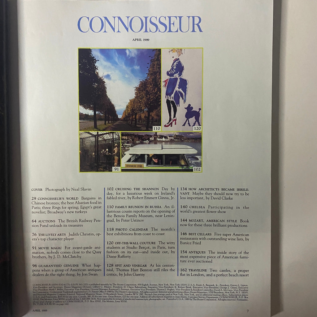 The Connoisseur Magazine April 1989 vintage issue is distinguished by its in-depth articles and analyses, spanning various topics such as fine art, architecture, and exclusive travel destinations. This issue is not only a reflection of its time but also a collectible that provides insights into the aesthetic tastes and cultural dialogues of the late 20th century.