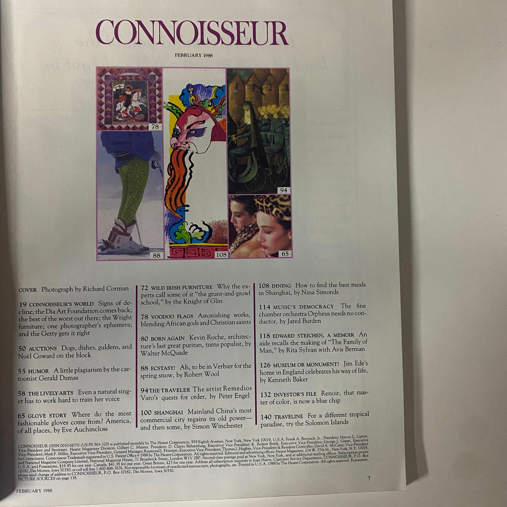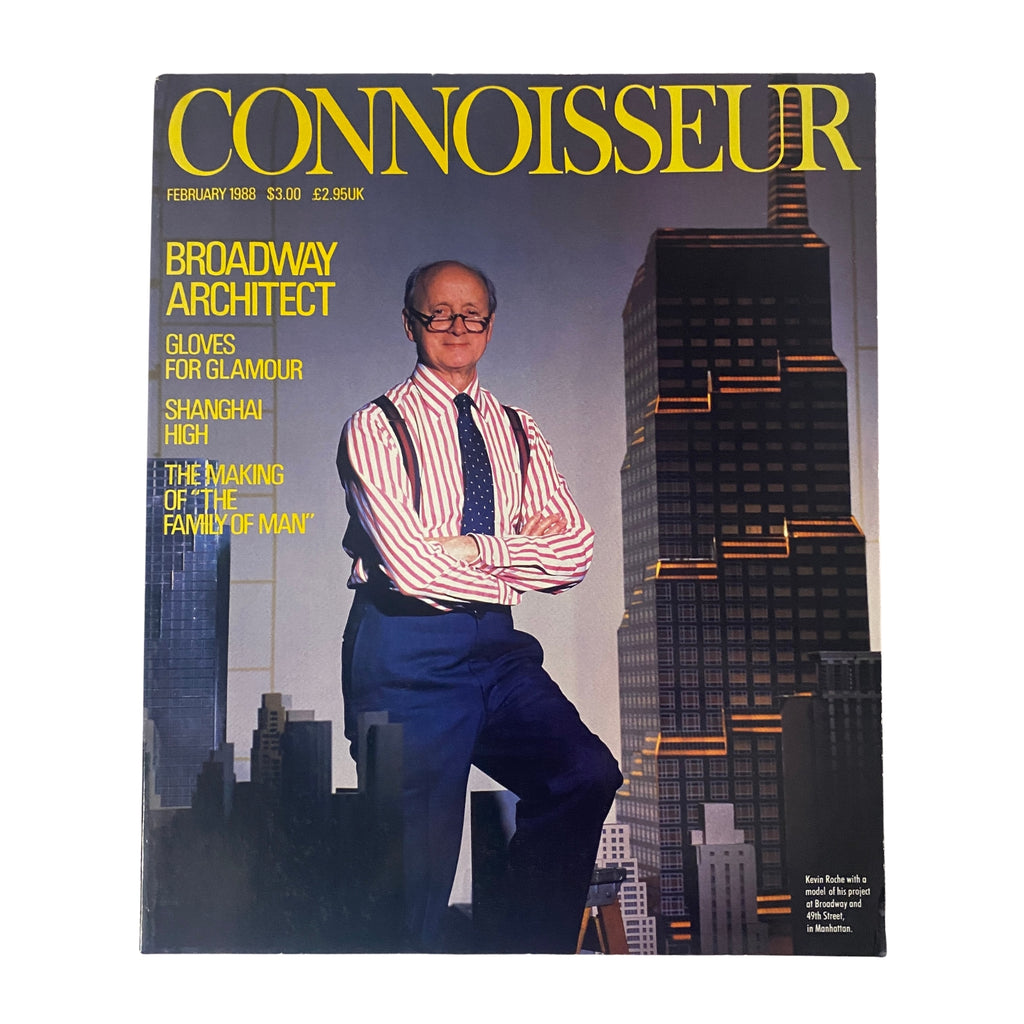 Discover the February 1988 issue of Connoisseur Magazine, featuring the intriguing cover story on Kevin Roche, a celebrated Broadway architect. This edition is a gem for enthusiasts of vintage magazines, offering a sophisticated exploration of global culture, fine design, and the intertwining realms of art, travel, and architecture.