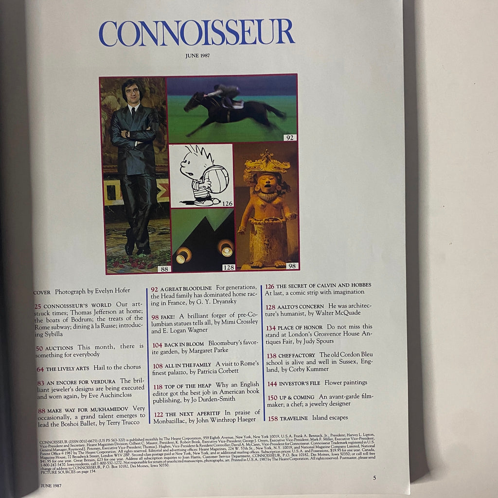 This vintage magazine, Connoisseur Magazine, from June 1987, features an illustrious cover story titled "The Bolshoi's New Star." This issue embodies the elegance and depth characteristic of the publications from this golden era. With captivating photography by Evelyn Hofer, it provides not just a glimpse into ballet's rich history but also explores various topics such as art, architecture, and culinary traditions.