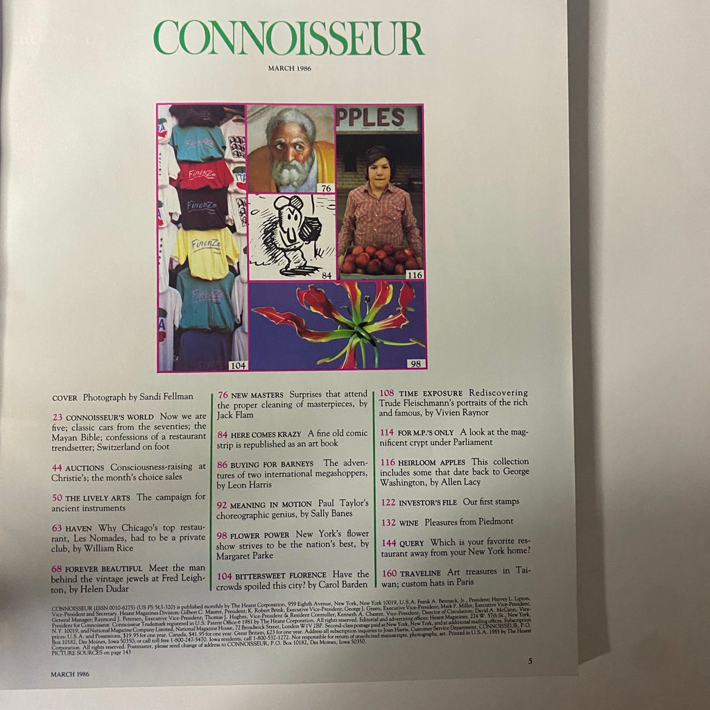 This is the March 1986 issue of Connoisseur Magazine, featuring the captivating cover story titled "Jeweler Extraordinaire." This vintage magazine takes readers on an opulent journey through the world of fine jewelry, culinary exclusivity, and high culture, making it a must-have for collectors of vintage magazines. The editorial direction of this issue is sharp and insightful, while the timeless visual style resonates with aficionados of luxury and elegance. Discover the artistry behind Fred Leighton’s outstanding craftsmanship alongside articles that span fascinating topics from heirloom apples to contemporary art in Taiwan.