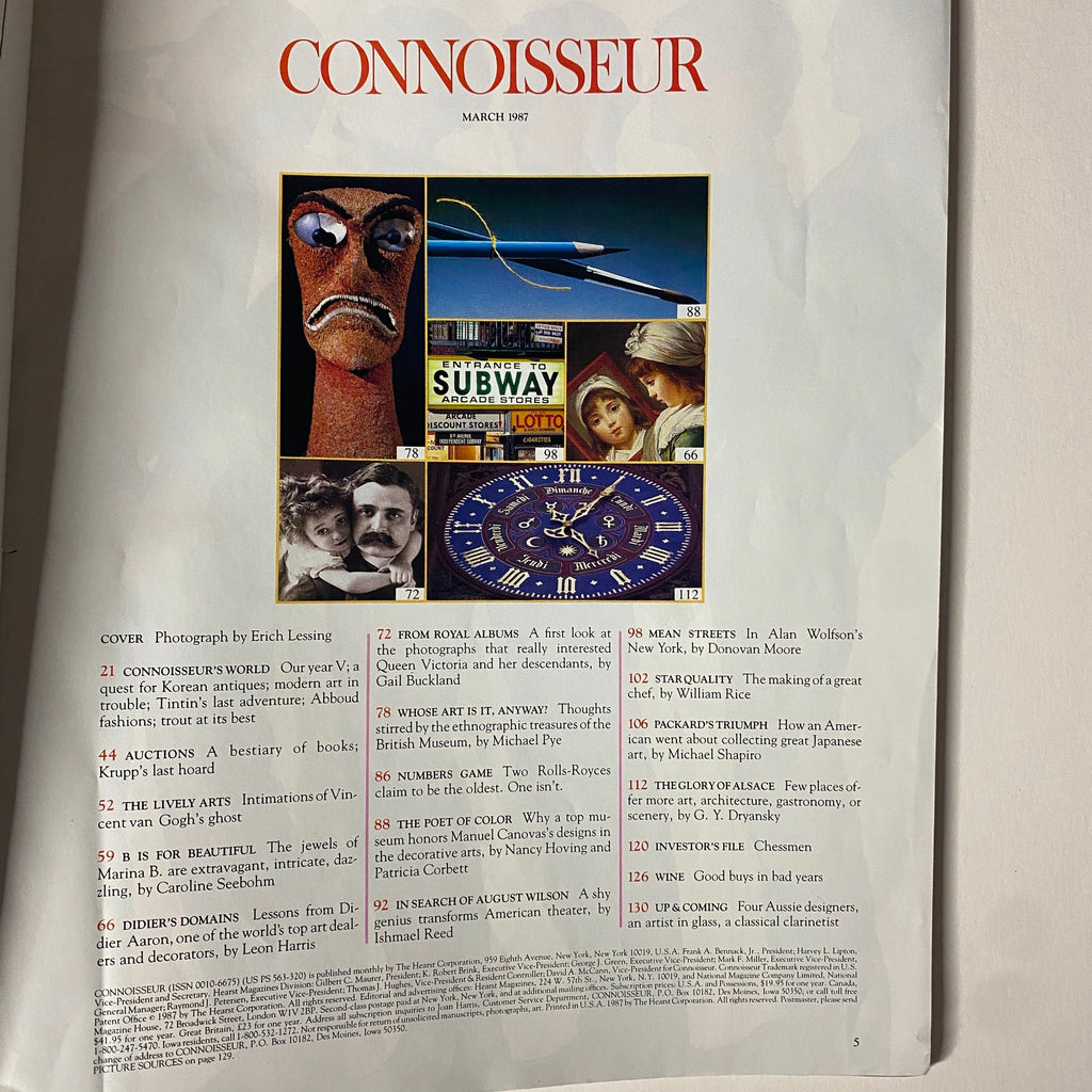 Immerse yourself in a world of hidden treasures and refined culture with this original Connoisseur Magazine March 1987 issue, featuring "The Unknown British Museum." Showcasing a distinguished cover photograph by Erich Lessing, this edition offers in-depth explorations of global art, rare collections, and influential personalities.
