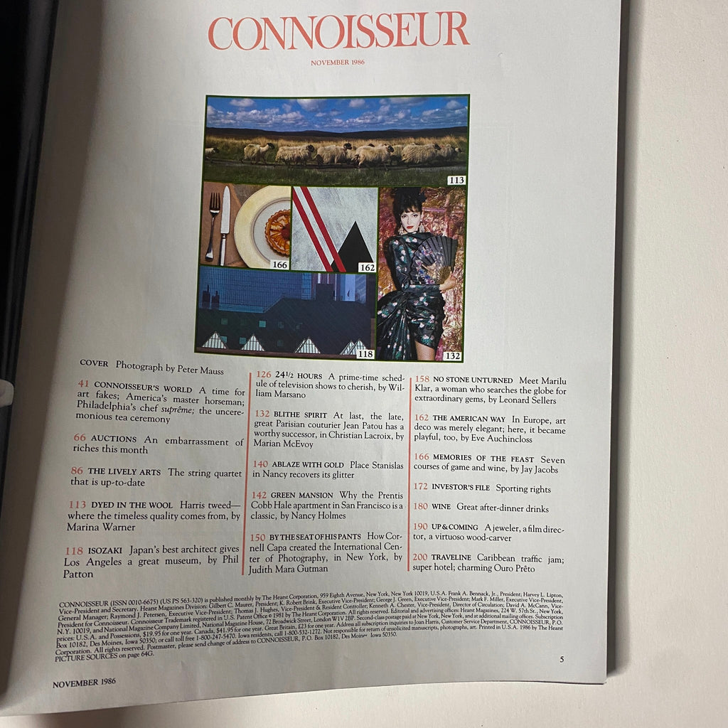Experience the refined world of culture, design, and travel with this original Connoisseur Magazine November 1986 issue, featuring "San Francisco Elegance." Showcasing a cover photograph by Peter Maass, this edition captures the sophistication and rich storytelling that defined Connoisseur during its prime.