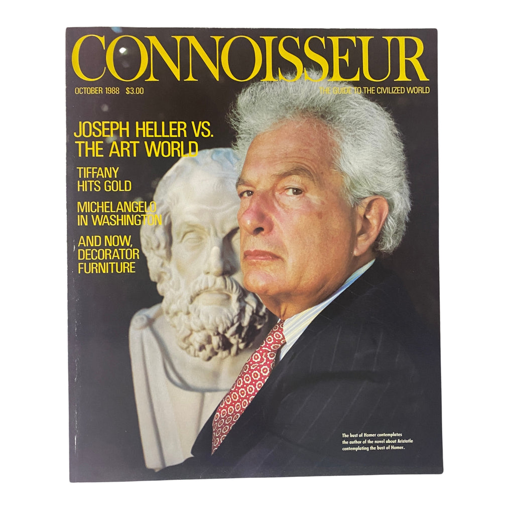 Discover a piece of literary and cultural history with this vintage issue of Connoisseur Magazine from October 1988. This edition features an intriguing exploration into the art world through the sharp wit of renowned author Joseph Heller, known for his classic work, Catch-22. The centerpiece article, "Joseph Heller vs. The Art World," offers a compelling excerpt from his novel Picture This, providing readers a unique perspective on pretentiousness in the art scene.