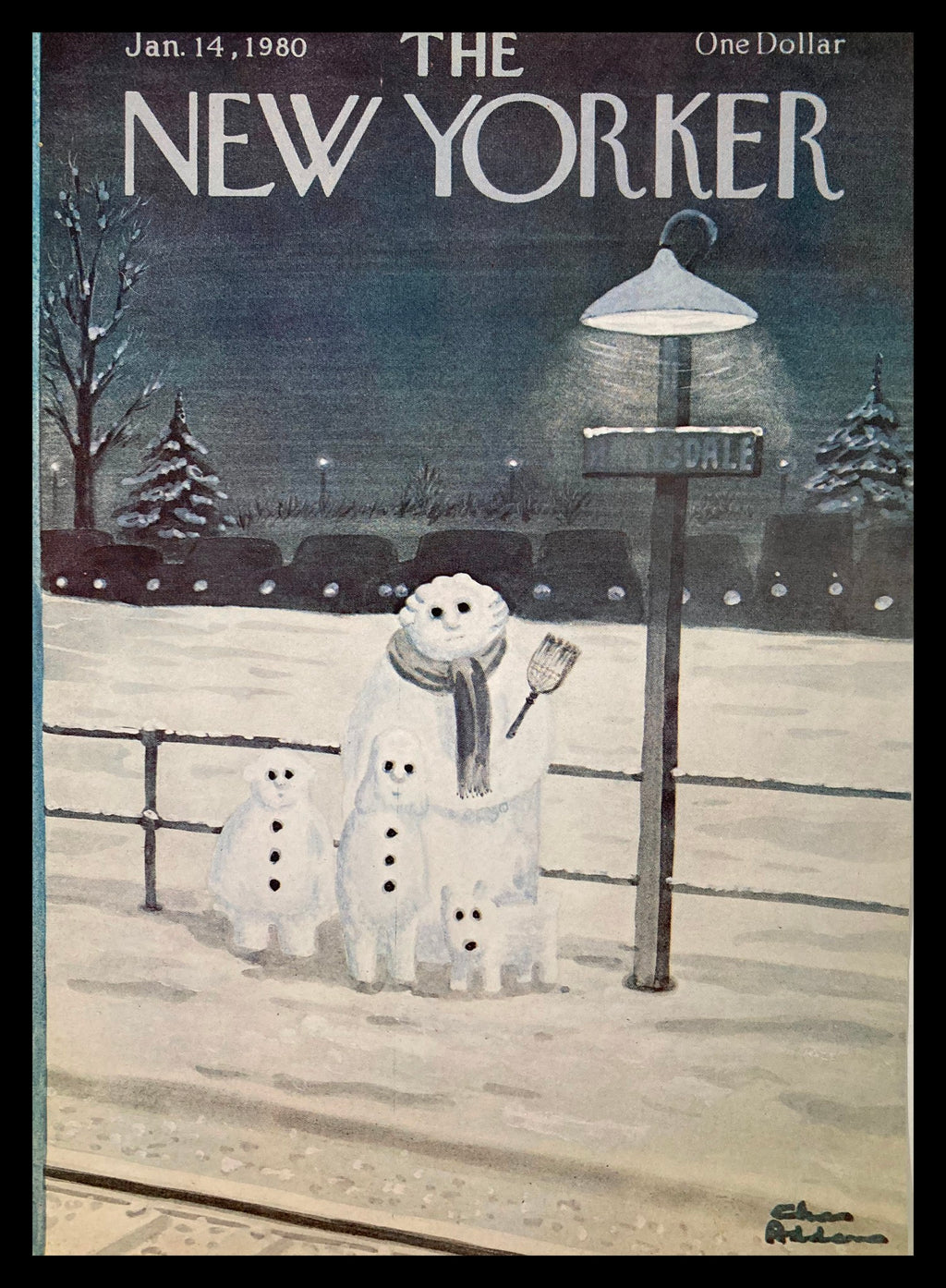 Immerse yourself in a piece of artistic history with the cover-only edition of The New Yorker from January 14, 1980, featuring the whimsical "Snow Family" illustration by the renowned Chas Addams. Known for his unique blend of macabre humor and eccentricity, Addams has created a delightful visual that captures the spirit of winter in an unforgettable way.