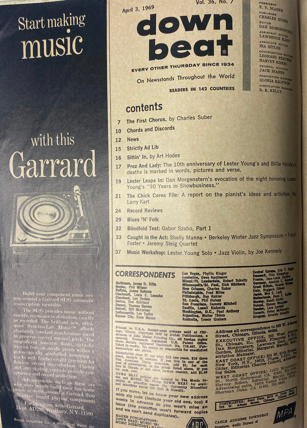 Down Beat Magazine April 3, 1969 Vol. 36 No. 7 Lester Young, Billie Holiday