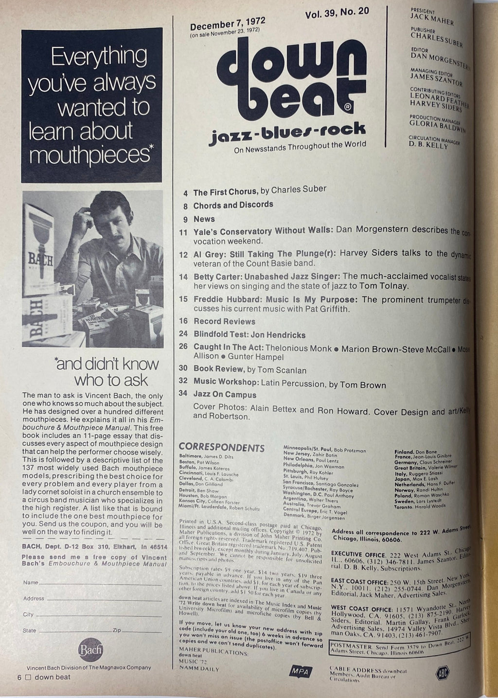 This vintage issue of Down Beat Magazine features cover photos of Alain Bettex and actor Ron Howard, with in-depth reporting and interviews highlighting major jazz figures of the early 1970s. Inside are features on Al Grey, Betty Carter, and Freddie Hubbard, along with reviews, campus reports, and performance coverage. A distinctive collectible for jazz enthusiasts and vintage magazine collectors.
