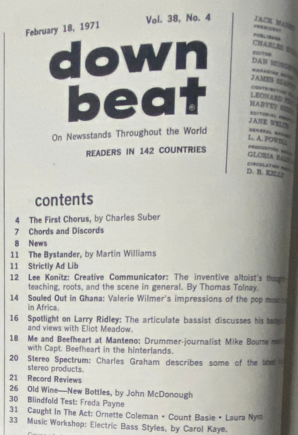 This vintage issue of Down Beat Magazine (February 18, 1971, Vol. 38 No. 4) features alto saxophonist Lee Konitz and bassist Carol Kaye, with in-depth articles on their careers and contributions to jazz and modern music. The issue also includes Valerie Wilmer’s look at Ghana’s pop scene, a spotlight on bassist Larry Ridley, and Mike Bourne’s colorful account of meeting Captain Beefheart.