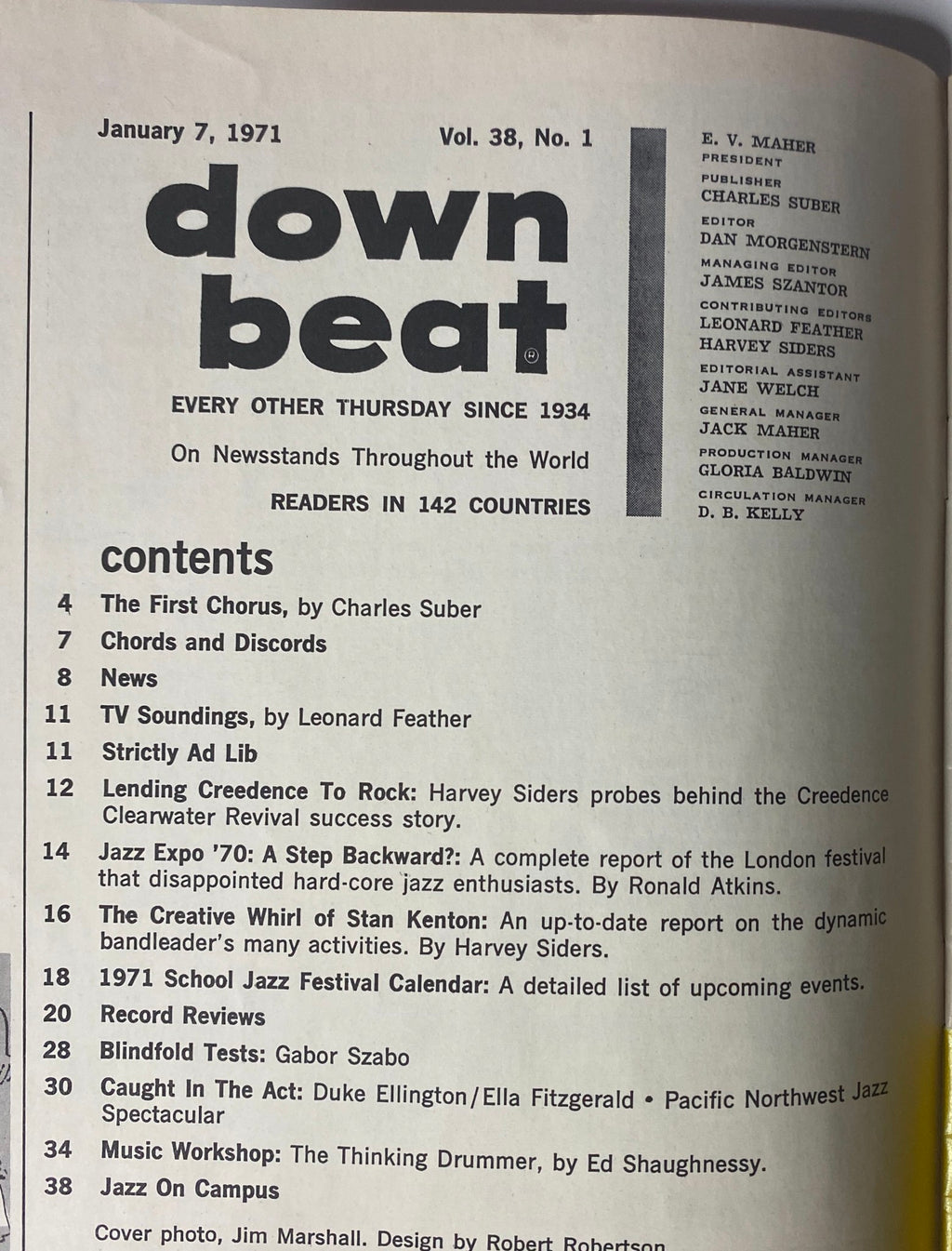 This January 7, 1971 issue of Down Beat magazine features legendary bandleader Stan Kenton in a full-length feature exploring his dynamic and evolving career. Also included are profiles on Creedence Clearwater Revival, coverage of Jazz Expo ’70, and a wide range of reviews, Blindfold Tests, and technical workshops. A strong issue reflecting the crossroads of jazz and popular music in the early 1970s.