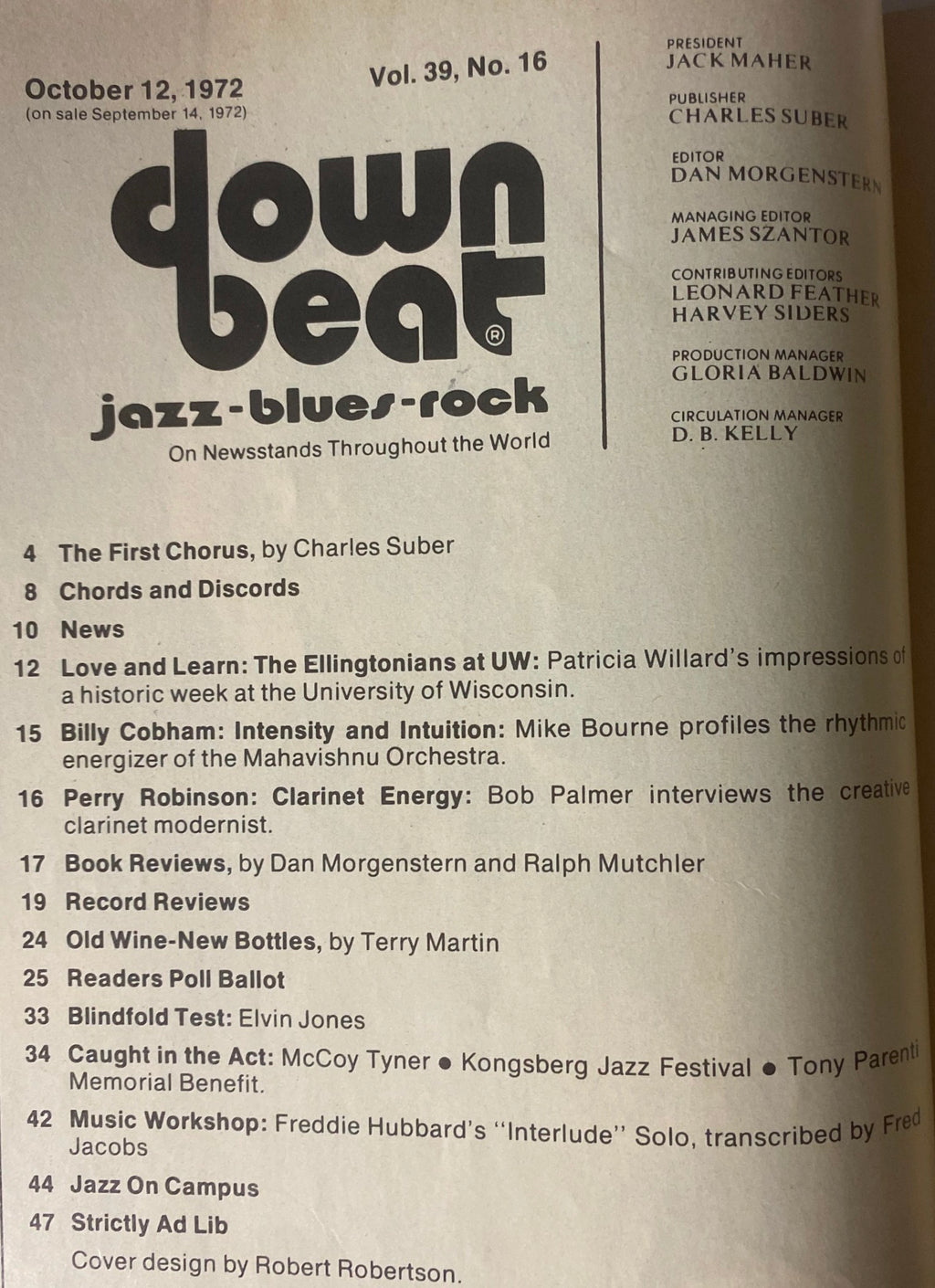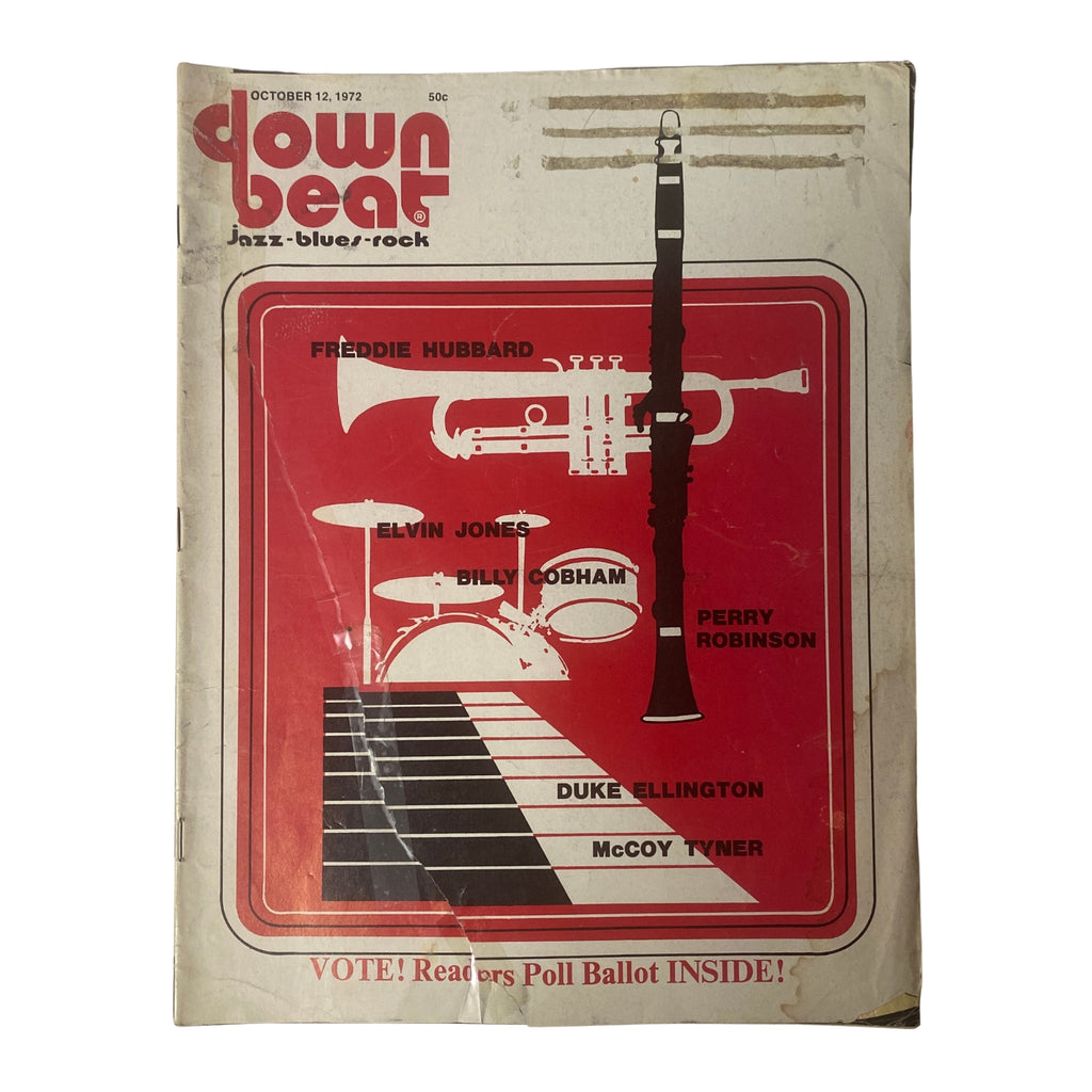 This October 12, 1972 issue of Down Beat magazine features master drummer Elvin Jones in a Blindfold Test, offering insights into his perspective on jazz and rhythm. Also included are features on Billy Cobham, Perry Robinson, and coverage of the Ellingtonians’ historic week at the University of Wisconsin. With reviews, transcriptions, and festival reports, this issue captures the evolving sound of jazz in the early 1970s.