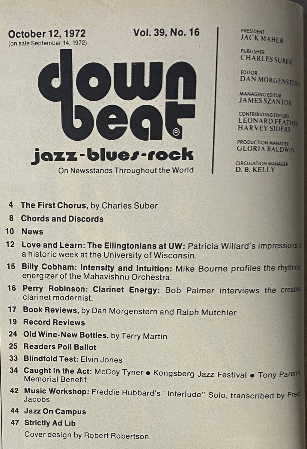 This vintage issue of Down Beat Magazine (October 12, 1972, Vol. 39 No. 16) features Freddie Hubbard and Elvin Jones, with in-depth coverage of leading jazz innovators and events of the early 1970s. Inside, readers will find performance highlights, artist interviews, and instructional features.