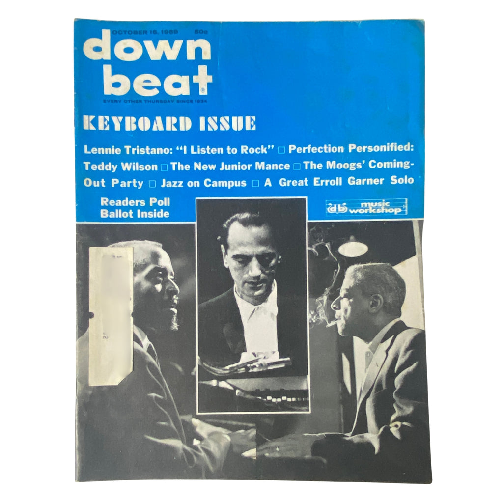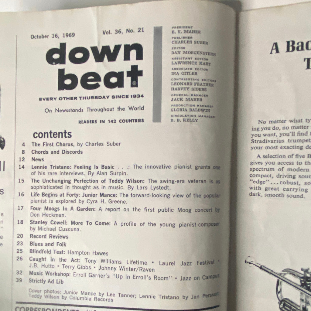 This vintage October 16, 1969 issue of Down Beat Magazine features pianist Lennie Tristano in one of his rare interviews, alongside a profile on swing-era legend Teddy Wilson. The issue also includes features on Junior Mance, Stanley Cowell, and a report on the first public Moog concert. The condition of the item is good. The magazine pictured in this listing is the exact copy you will receive. Please check the photos for condition details.