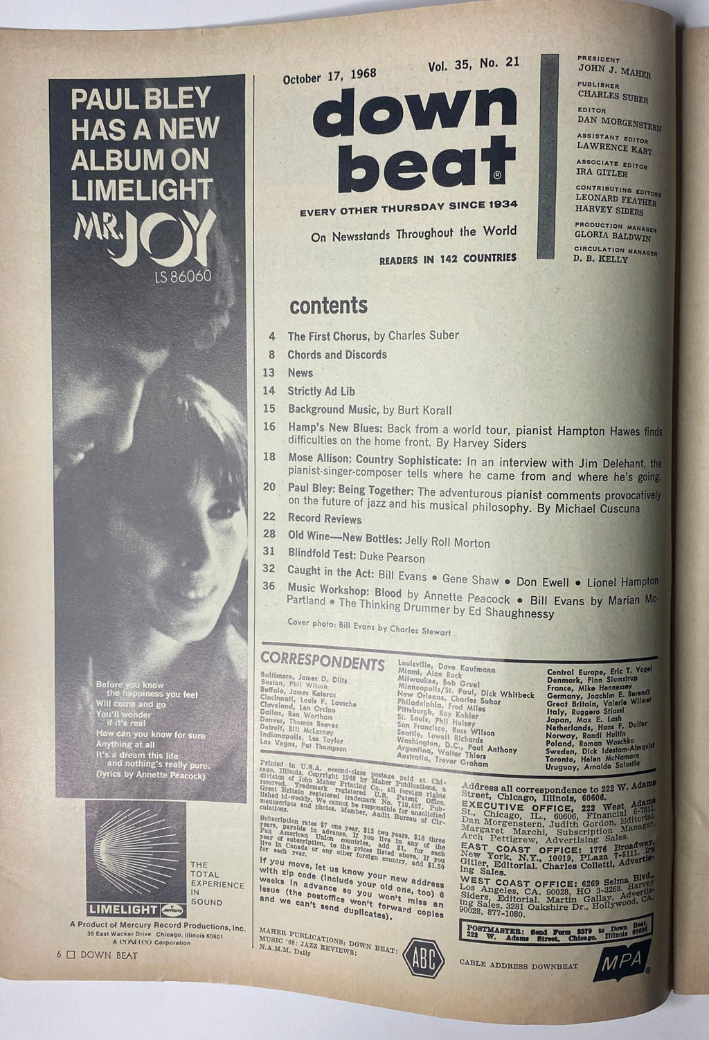 Down Beat Magazine – October 17, 1968 (Vol. 35 No. 21) – Hamp Hawes, Mose Allison Cover