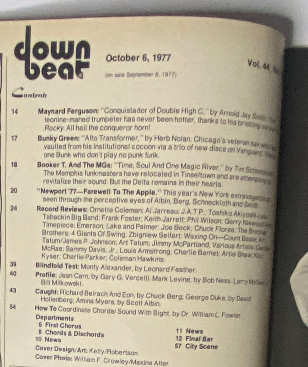 This vintage issue of Down Beat Magazine (October 6, 1977) features Maynard Ferguson, Bunky Green, and Booker T. & the MGs. With interviews, festival coverage, and reviews, the issue captures the diverse sounds of the late 1970s jazz and funk landscape.