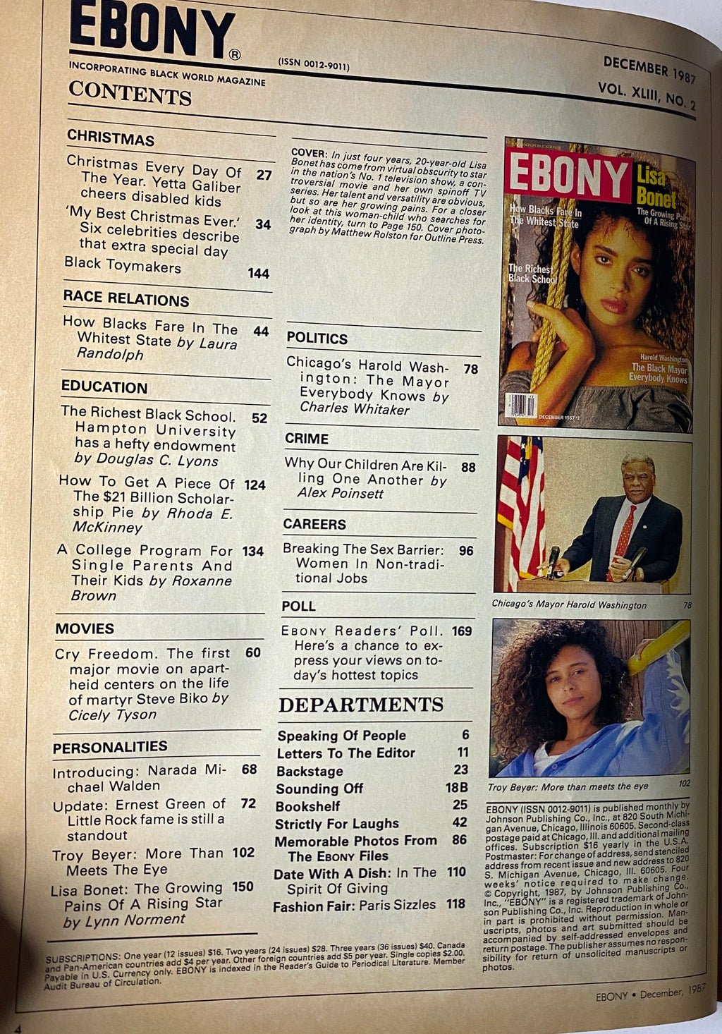 This December 1987 issue of Ebony Magazine features rising television star Lisa Bonet on the cover in a revealing and reflective feature titled “The Growing Pains of a Rising Star.” At just 20 years old, Bonet had already captivated audiences with her unique style and charisma, while navigating fame, identity, and womanhood on her own terms. This issue is rich with thoughtful articles spanning entertainment, education, race, politics, and the holiday spirit.