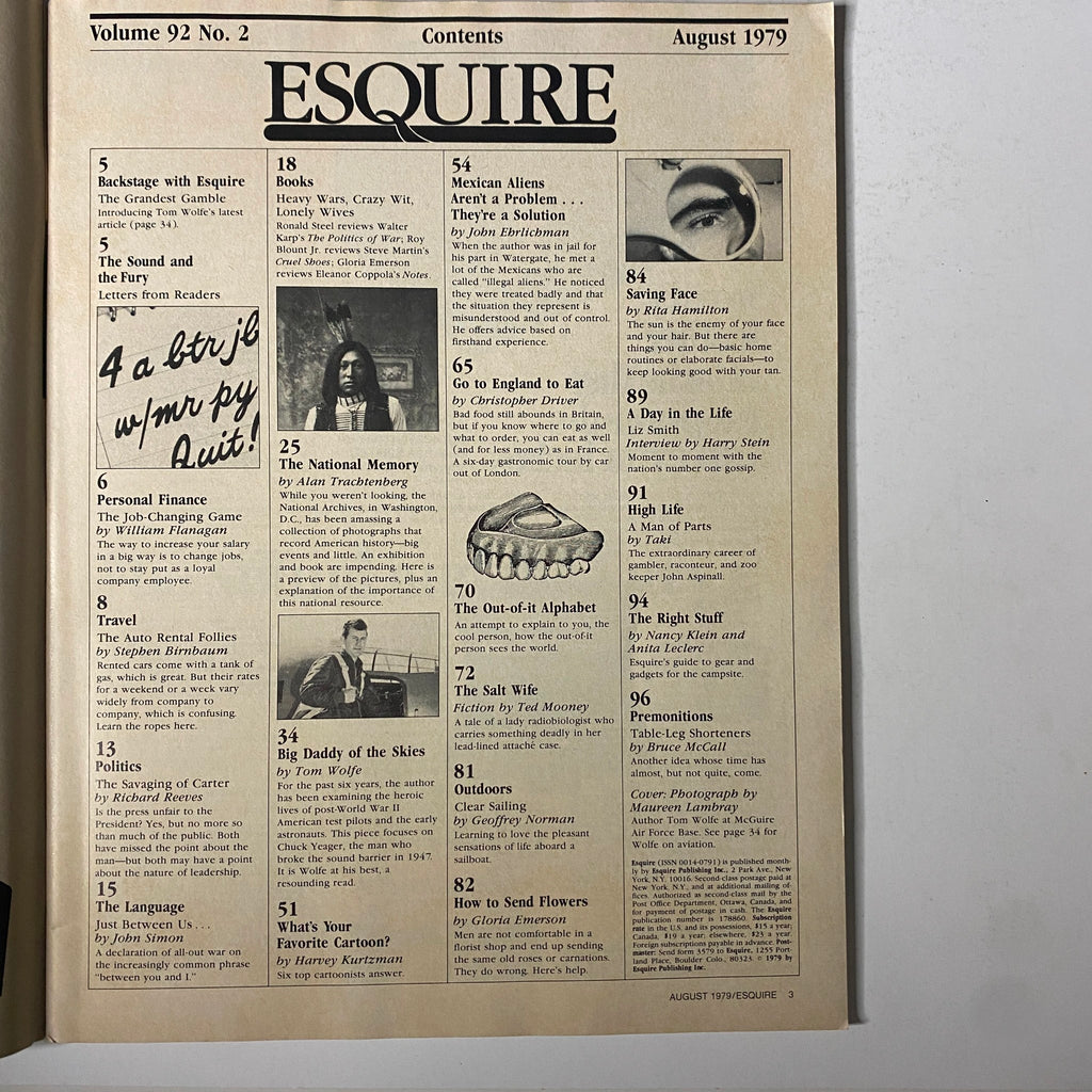 This rare August 1979 issue of Esquire Magazine showcases legendary author Tom Wolfe's captivating cover story at McGuire Air Force Base, diving deep into the exhilarating world of American test pilots and the iconic Chuck Yeager, who famously broke the sound barrier. Vintage magazine collectors will appreciate this significant piece not just for its fascinating content but also for its reflection of the cultural and political sentiments of the late 1970s.