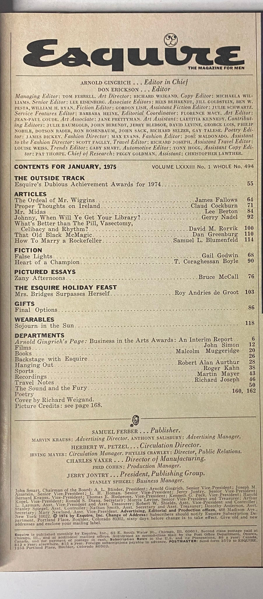 This vintage issue showcases Esquire's distinctive blend of investigative journalism, culture, humor, and style, making it a compelling addition to any collection. Among its highlights are the Dubious Achievement Awards for 1974, a satirical overview of the year’s most notable faux pas in politics and public life. Readers can also enjoy insightful articles like The Ordeal of Mr. Wiggins by James Fallows, which delves into personal struggles during a transformative period in American history.