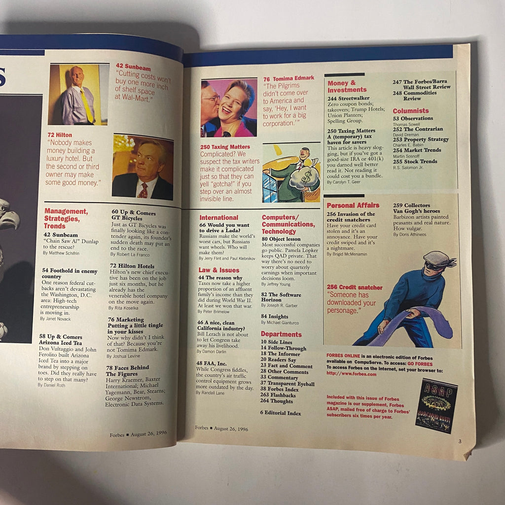This August 26, 1996 issue of Forbes features the Mutual Fund Survey and a range of in-depth stories about finance, management, and technology in the mid-1990s. A highlight is “Chain Saw Al” Dunlap to the Rescue? on Sunbeam’s turnaround. Also inside are lively profiles, investment guidance, and a look at how credit theft was starting to evolve in the digital age.