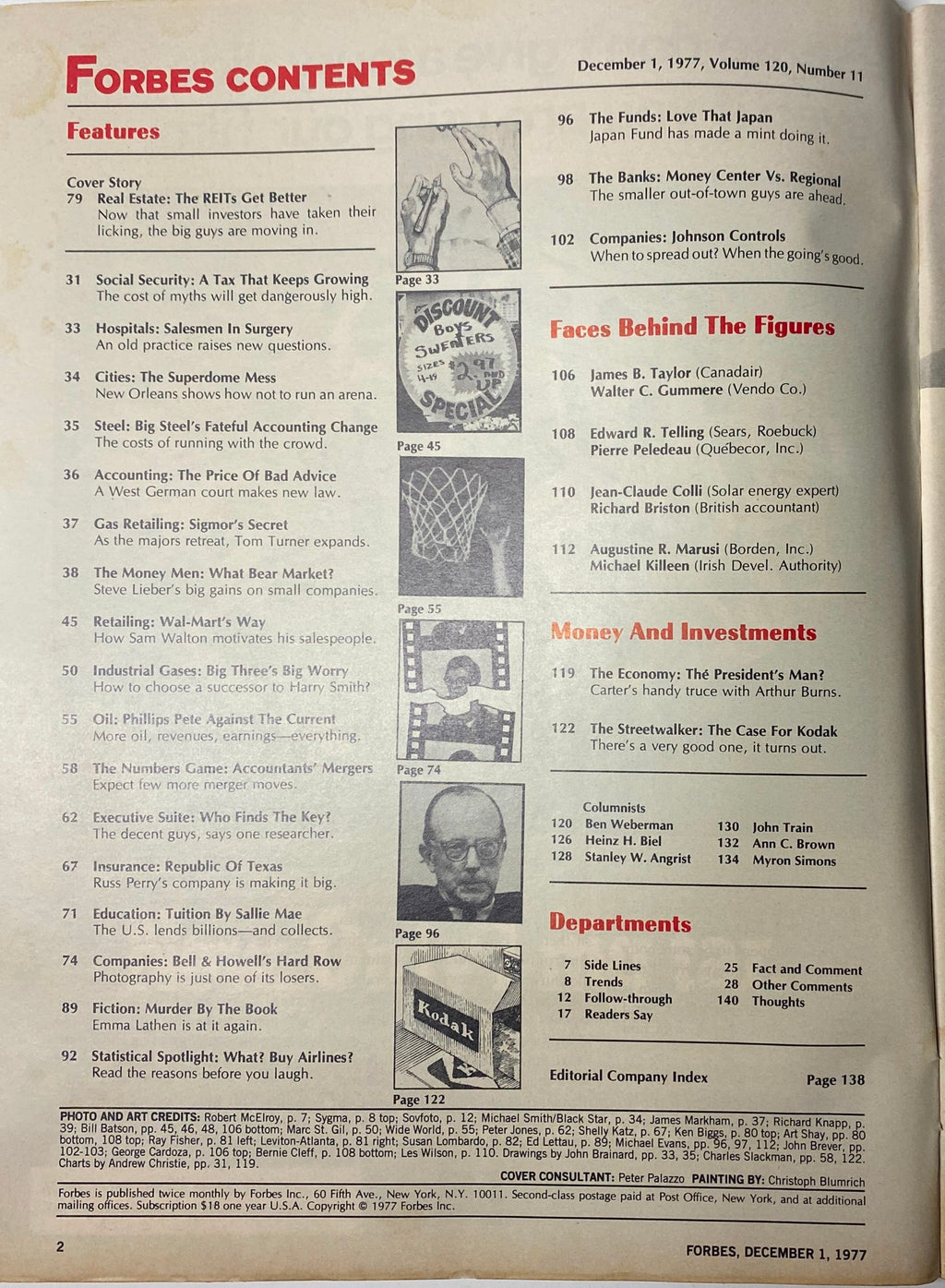 This vintage Forbes Magazine issue from December 1, 1977, provides a captivating exploration of the real estate investment trust (REIT) market. Titled "Real Estate: The REITs Get Better," this cover story delves into the shift in investment strategies as institutional investors emerge while smaller investors face challenges in the market. It reflects a pivotal moment in economic history, making it a significant collectible for both investors and history enthusiasts.