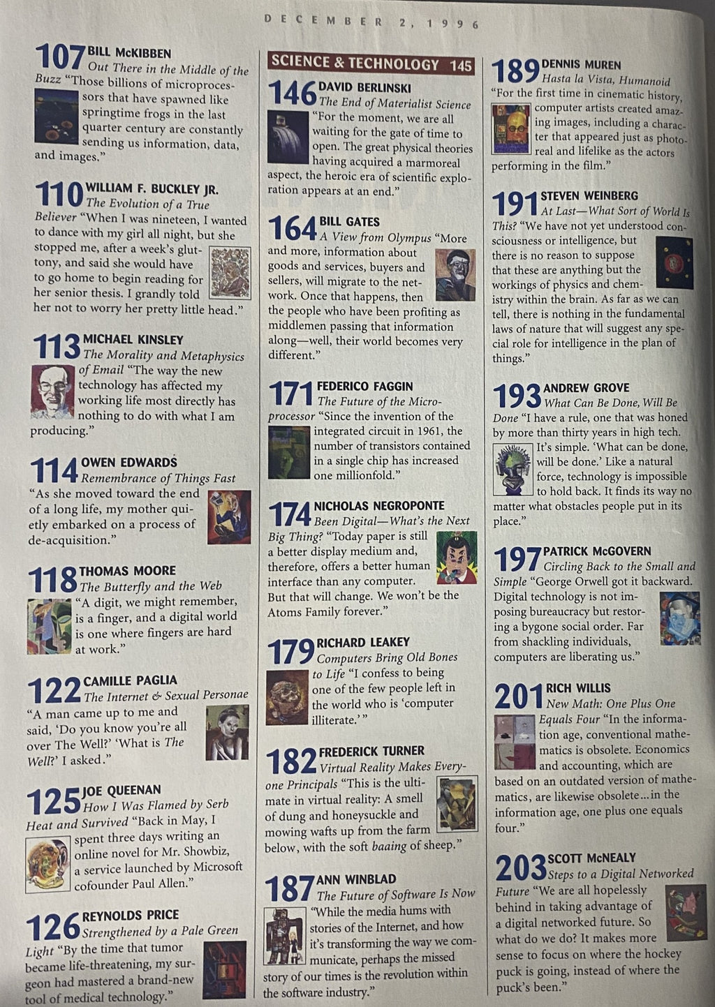 This special December 2, 1996 edition of Forbes is titled “The Big Issue” and features a collection of essays and reflections on technology, culture, and the fast-changing digital world of the late 1990s. Contributions come from notable voices such as Bill Gates, Camille Paglia, Thomas Moore, Nicholas Negroponte, Andrew Grove, and more.