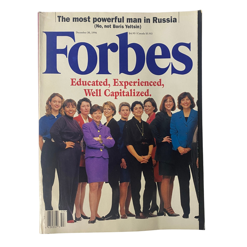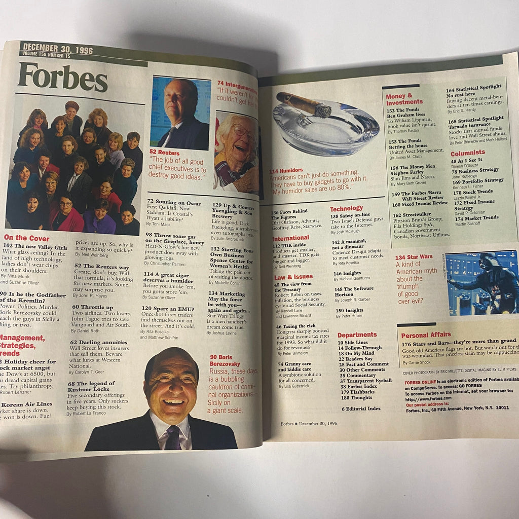 This December 30, 1996 issue of Forbes features the cover story “The New Valley Girls,” profiling women who were breaking barriers in Silicon Valley’s high-tech world. Inside are articles on Boris Berezovsky’s rise in Russia, innovative cigars and humidors, value-stock investing, and more.