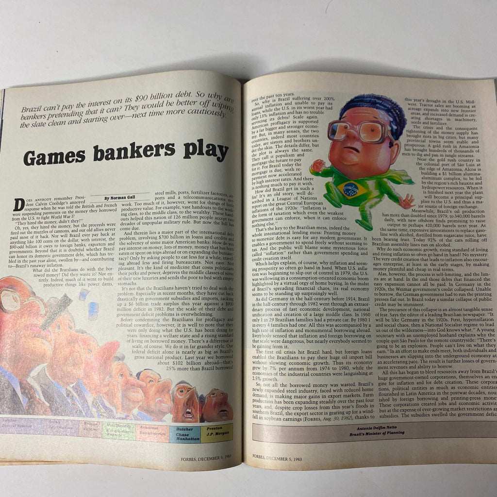 Discover a remarkable piece of financial history with this vintage issue of Forbes Magazine, dated December 5, 1983. This captivating magazine, Volume 132, Number 13, features the compelling cover story titled "Brazil and The Bankers," which examines Brazil's staggering $90 billion debt crisis and its implications on global finance.