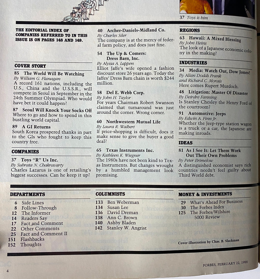 - Corporate Analysis: Insightful articles on leading companies of the time, such as Toys "R" Us and Texas Instruments, showcasing their challenges and growth.
