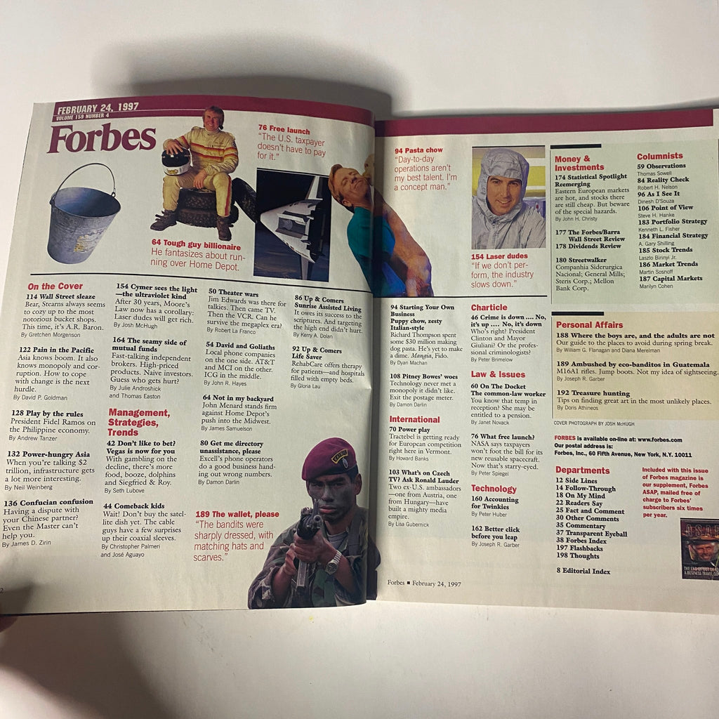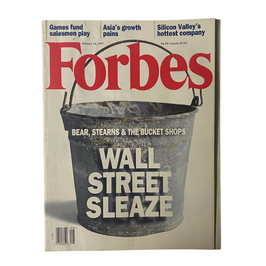 This February 24, 1997 issue of Forbes investigates “Wall Street Sleaze,” a hard-hitting exposé on Bear Stearns and its ties to notorious brokerage houses. The issue also spans topics from Asian infrastructure and corruption to the rise of laser technology, mutual fund pitfalls, and the seamy side of telephone directories.