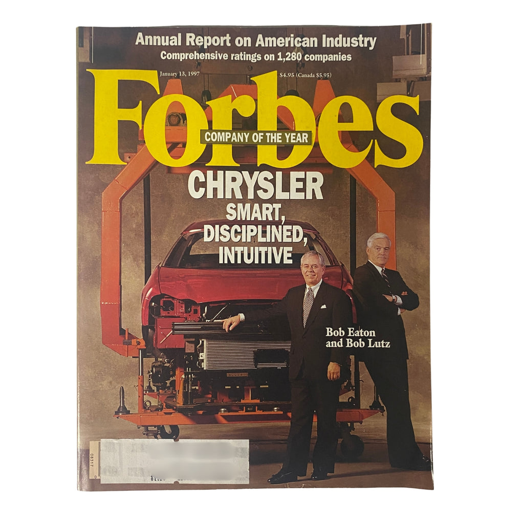 This January 13, 1997 issue of Forbes spotlights Chrysler Corporation as “Company of the Year,” profiling executives Bob Eaton and Bob Lutz during a time of innovation, sleek automotive design, and strong financial results. It also features the 49th Annual Report on American Industry with detailed sector rankings, corporate profiles, and analysis of trends shaping the U.S. and global markets.