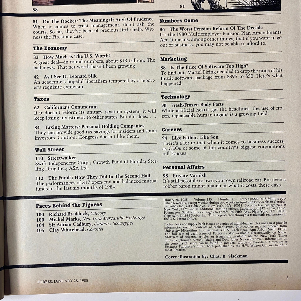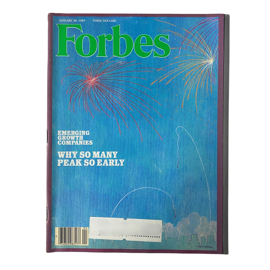 This vintage issue of Forbes Magazine, dated January 28, 1985 (Volume 135, Number 2), is a significant collectible for enthusiasts of economic history and business insights. It dives into the world of emerging growth companies at a pivotal moment in the mid-1980s, providing a unique perspective on market trends, corporate transformations, and the dynamics that shaped that era.