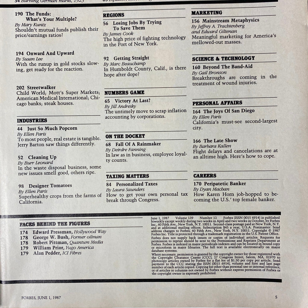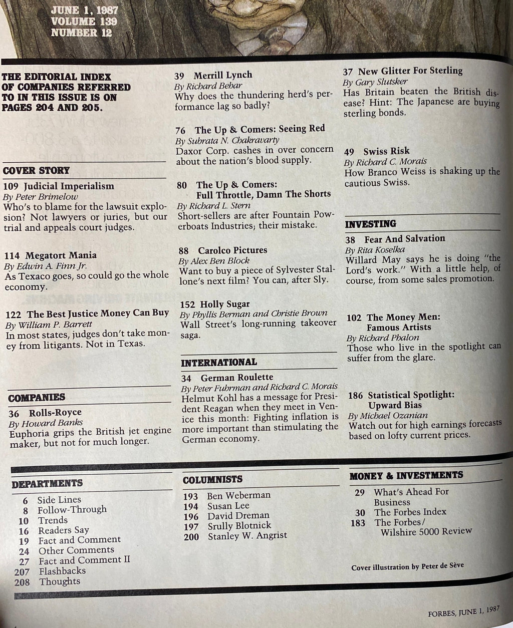 Explore the intriguing world of vintage magazines with the June 1, 1987 issue of Forbes Magazine, featuring the captivating cover story "Judicial Imperialism" by Peter Brimelow. This collectible magazine takes you back to a pivotal moment in American history, shedding light on the legal and corporate trends that defined the late 1980s.