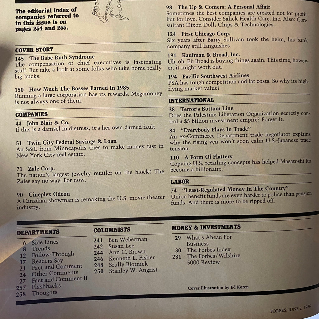 This vintage issue of Forbes Magazine, dated June 2, 1986, is a fascinating exploration of executive compensation during a pivotal time in business history. Featuring the cover story "The Babe Ruth Syndrome," this magazine delves into the world of individuals whose earnings eclipse those of even the highest-paid corporate executives. This compelling narrative highlights the disparities in income among top earners and sets the stage for ongoing discussions about wealth distribution, corporate responsibility, and market dynamics.