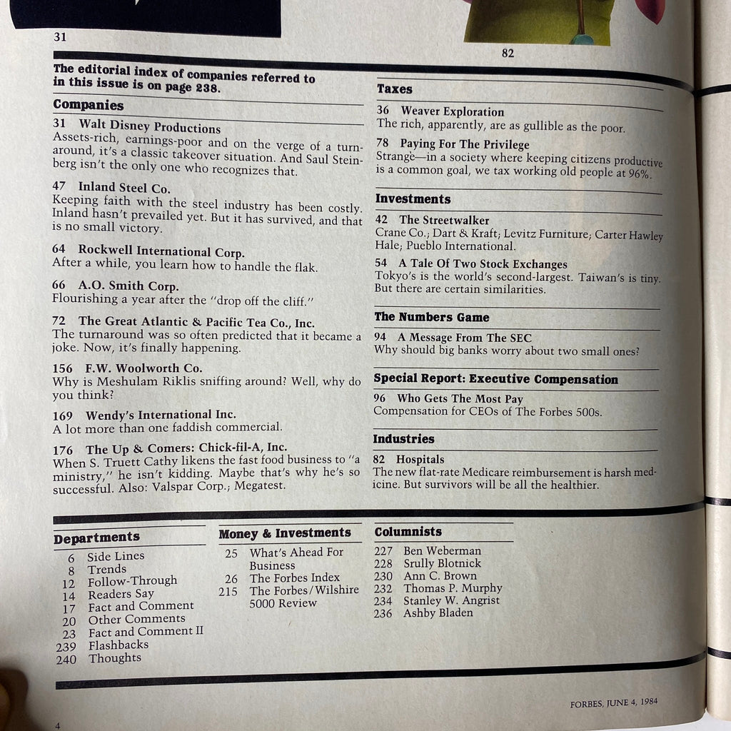 This June 1984 issue of Forbes Magazine offers a rare glimpse into the past, making it an essential addition for investors, Disney fans, and collectors of vintage magazines. Additional highlights include major industry analyses, executive pay scales from the Forbes 500 list, and emerging economic trends.