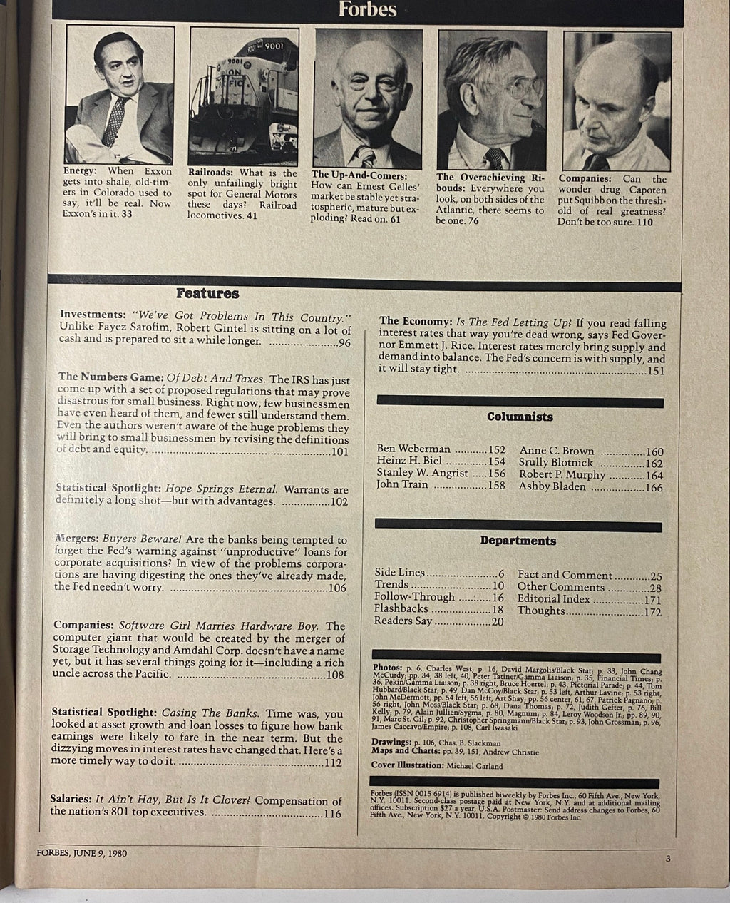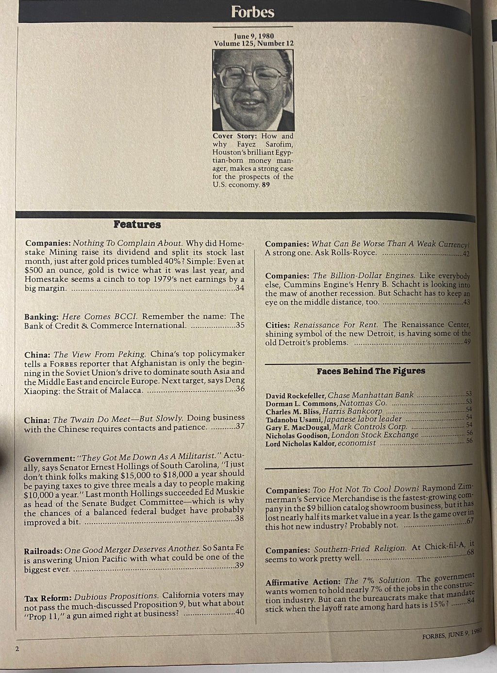 This vintage Forbes Magazine issue from June 9, 1980, is a treasure for collectors and enthusiasts alike. Featuring a compelling cover story on the influential money manager Fayez Sarofim, this particular edition provides a deep insight into the investment landscape of the time. Sarofim, an Egyptian-born financier based in Houston, presents a strong case for the resilience of the U.S. economy amid recession fears, making this issue particularly significant for anyone interested in finance or business history.