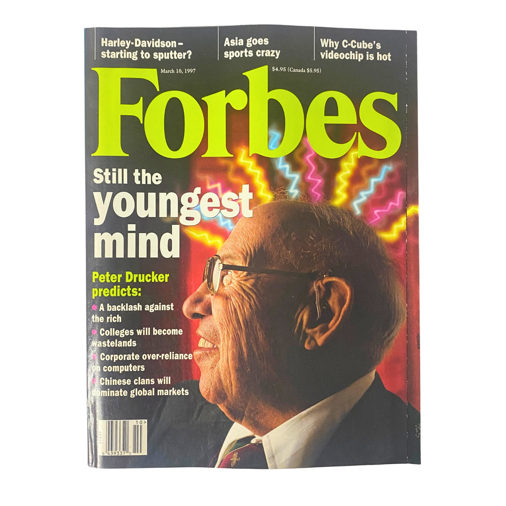 This March 10, 1997 issue of Forbes spotlights legendary management thinker Peter Drucker, offering an in-depth feature on his enduring influence and warnings for a booming economy. The issue also explores topics ranging from Harley-Davidson’s brand makeover to sports sponsorships in Asia and the biotech revolution in agriculture.