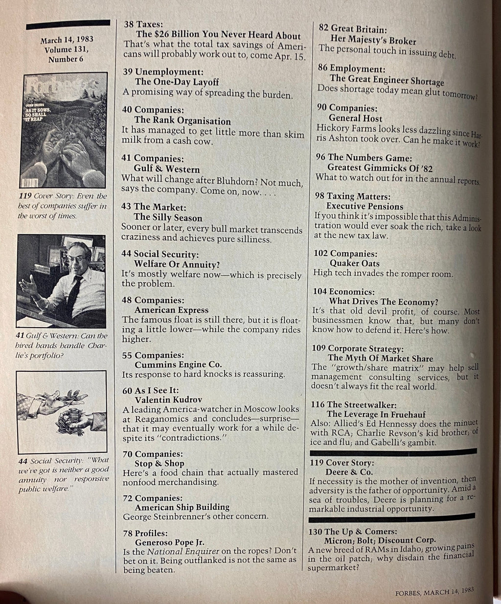 Step back in time with this fascinating vintage magazine, the Forbes Magazine dated March 14, 1983. This issue features a compelling cover story centered around Deere & Co., an agriculture giant, highlighting their resilience in the face of economic adversity and their strategic positioning for future growth opportunities.