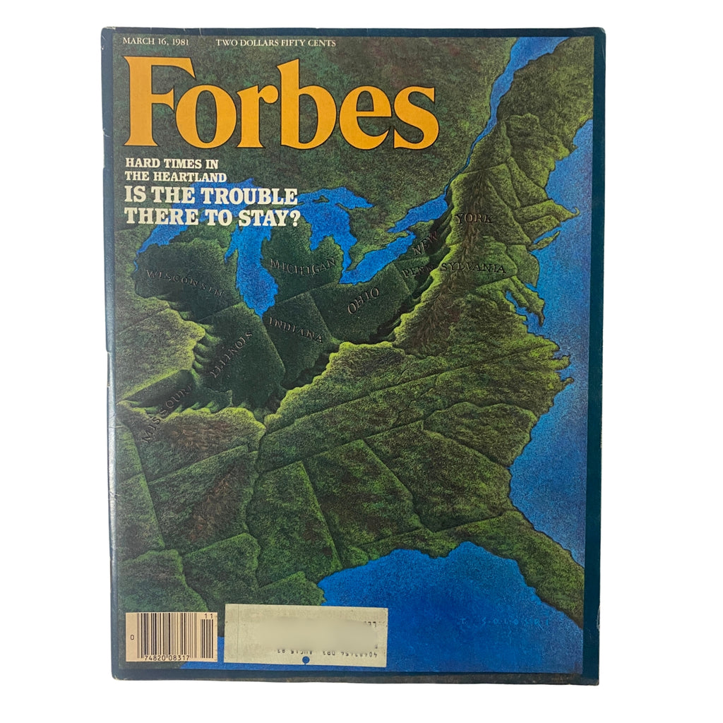 This vintage issue of Forbes Magazine, dated March 16, 1981, features the compelling cover story titled "Is The Midwest Dying?". This historic edition delves into the critical economic and industrial challenges facing America's heartland during the early 1980s. It's a significant reflection of a transformative period, examining parallels to the industrial decline previously seen in New England.