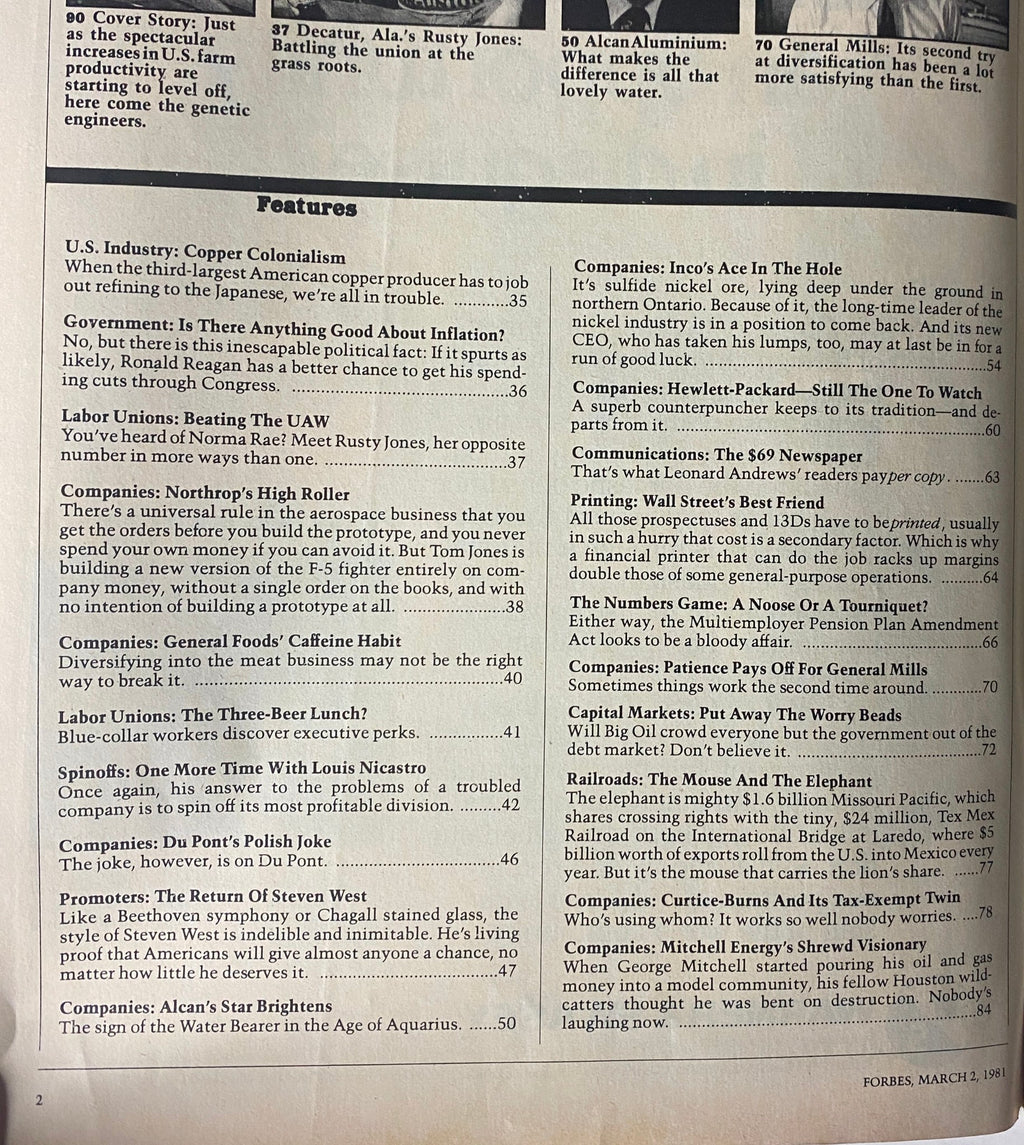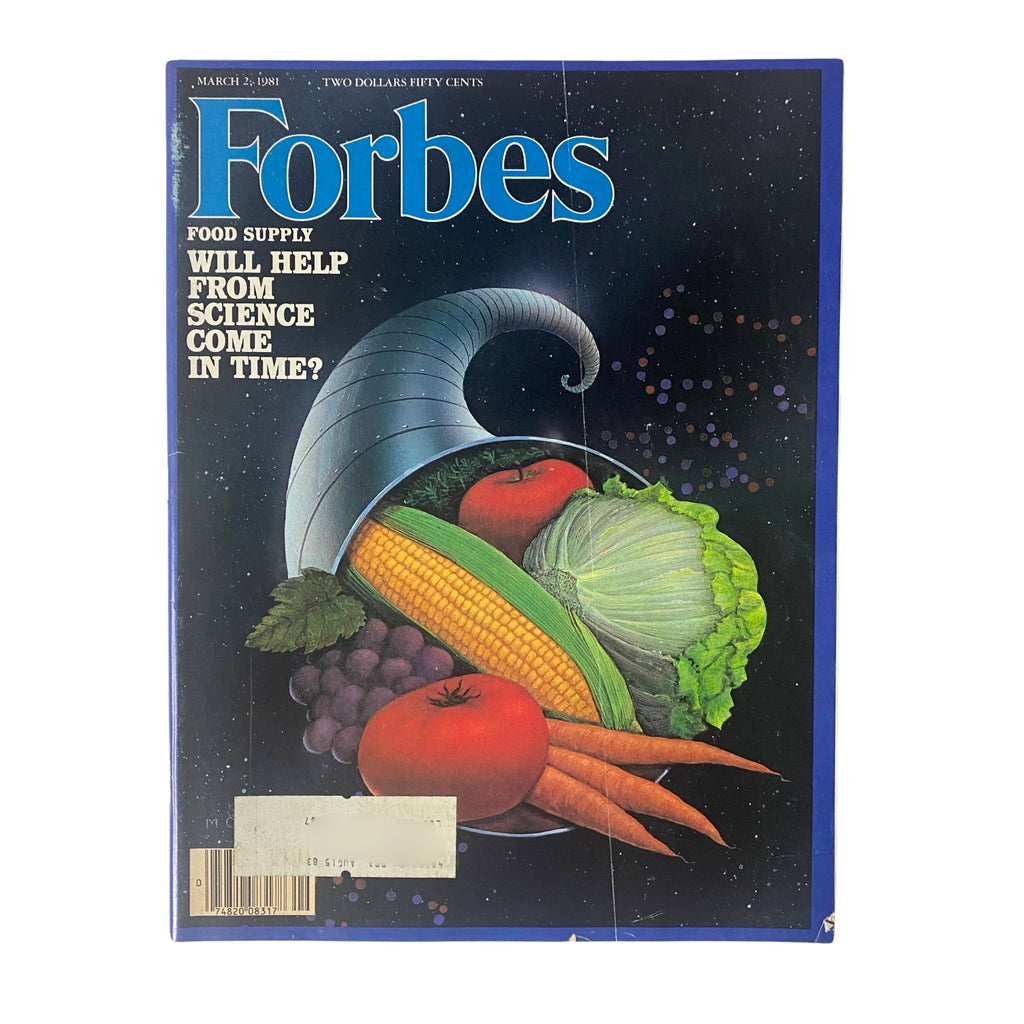 Experience a slice of history with the March 2, 1981 issue of Forbes Magazine. This vintage magazine provides an insightful look into the economic, corporate, and financial landscapes of the early 1980s. The cover story titled "Food Supply Will Help From Science Come in Time" discusses pivotal advancements in science aimed at ensuring a stable food supply amidst rising global demands.